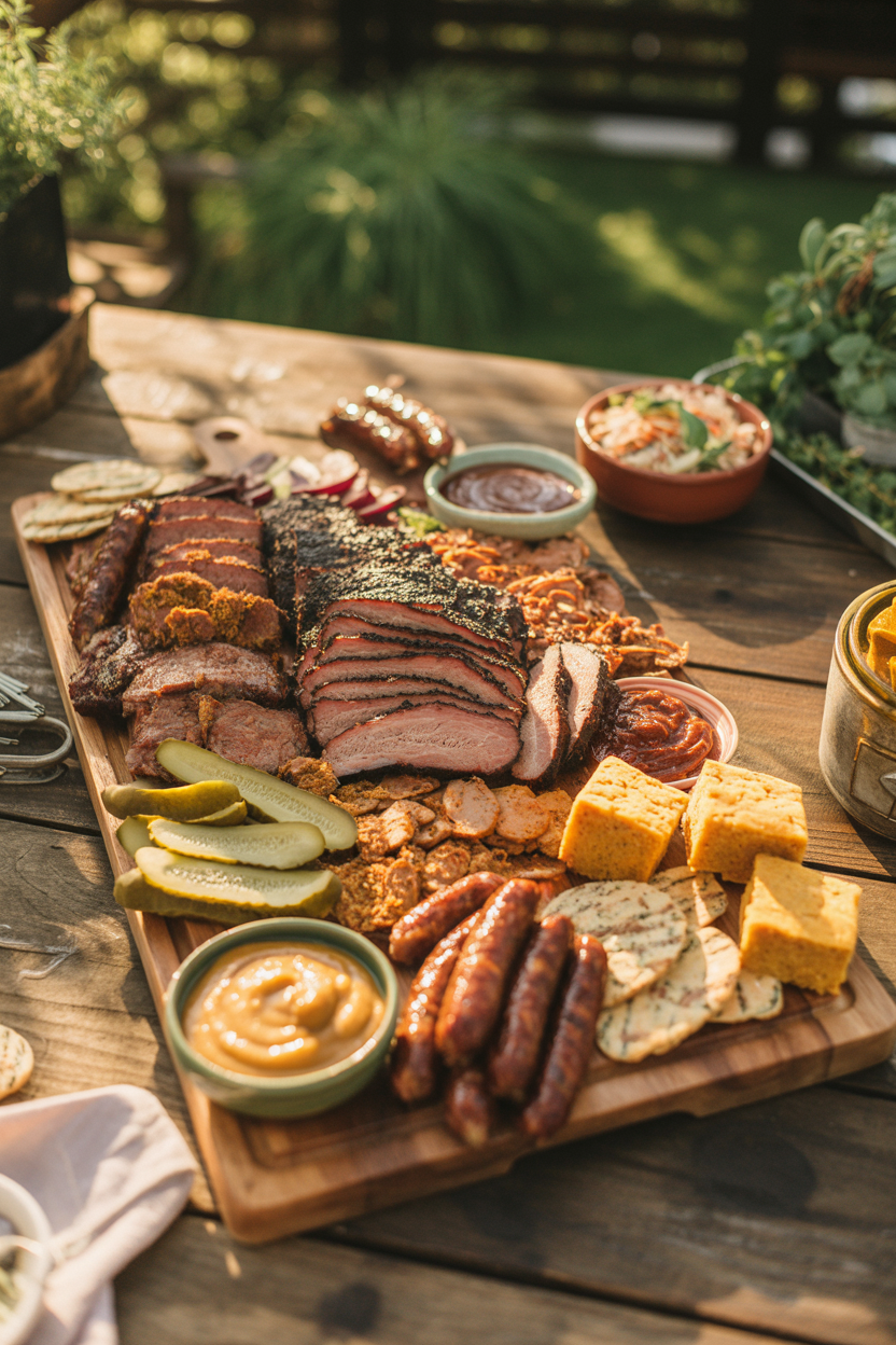 This is where I like to start when I want immediate visual impact. A loaded BBQ charcuterie board brings together multiple BBQ food ideas in one place, and it naturally becomes the centerpiece of the table. I’ll layer sliced brisket, pulled pork, grilled sausages, pickles, and small bowls of sauces, then fill in gaps with cornbread or crackers. The key is to build it low and full, letting everything feel abundant but still easy to access.