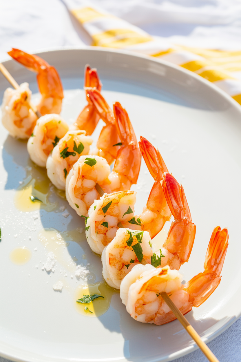 Seafood is often overlooked in BBQ grill food ideas, but it adds such a nice variation. I keep the presentation simple—lined up skewers with a light drizzle of butter—so the natural color of the shrimp stands out.