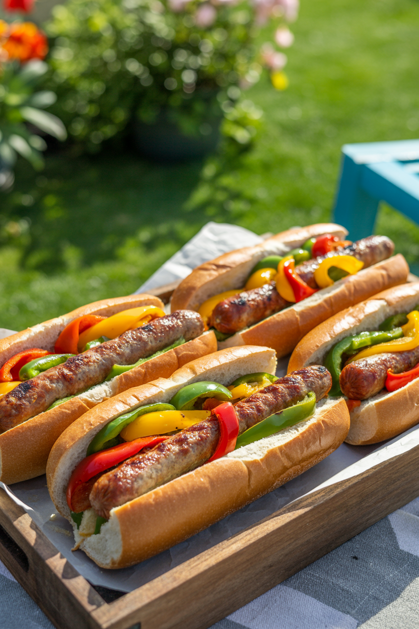 These are perfect for more casual backyard BBQ food ideas. I’ll slice the sausages and layer them with peppers in soft rolls, then arrange everything on a tray so it feels cohesive and easy to grab.