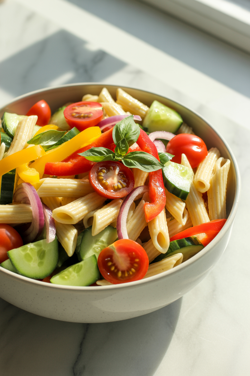 Pasta salad is one of those easy BBQ sides that rounds out the table. I keep the colors bright and the ingredients simple so it complements everything else without competing.