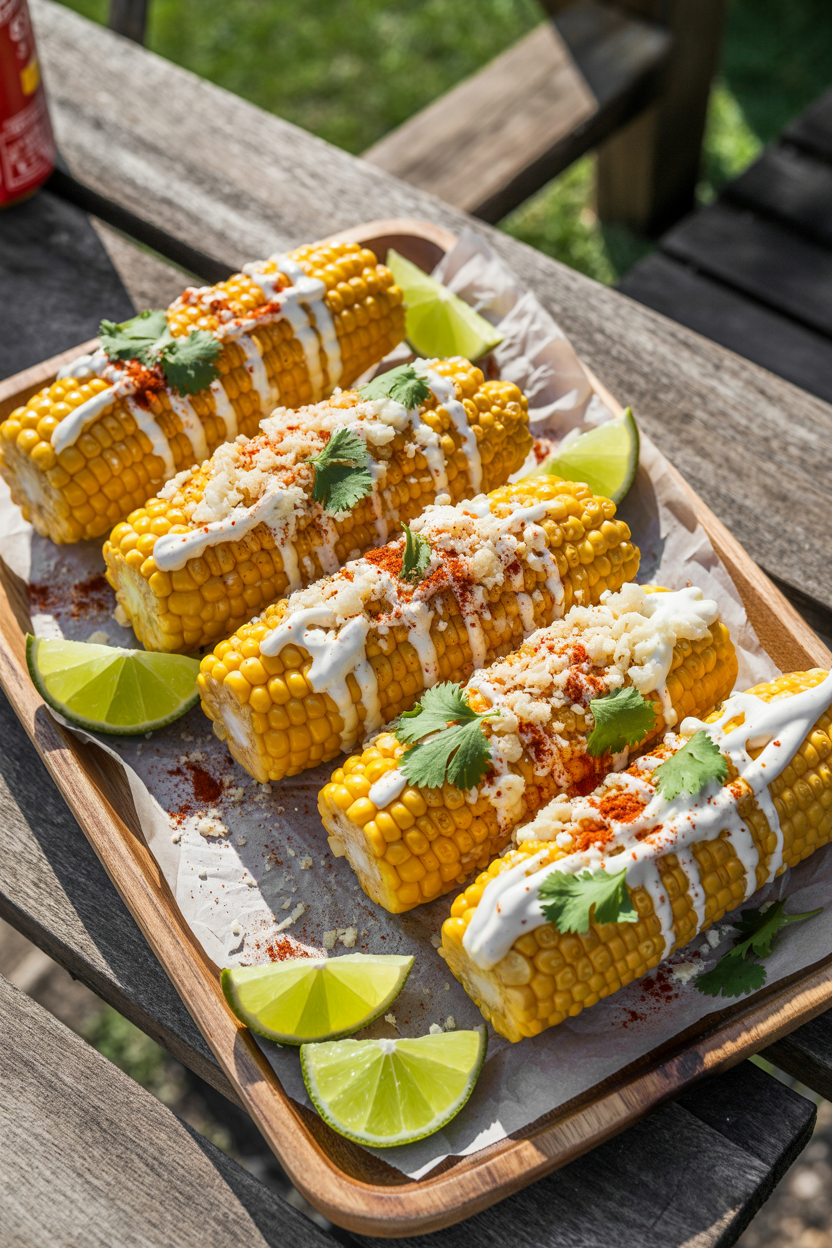 Grilled corn adds instant color and texture to any backyard BBQ food spread. I roll each ear in a creamy topping, then finish with crumbled cheese, lime, and a touch of chili. It’s slightly messy in the best way, and when you line them up on a long platter, it becomes one of those dishes people reach for immediately.