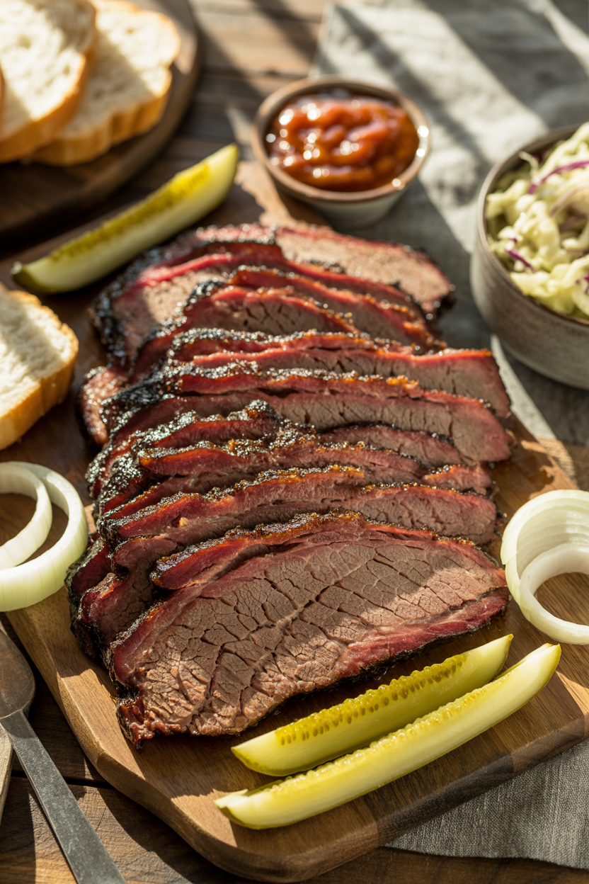 When I want something that feels a bit more substantial, I go with brisket. It anchors the table and works beautifully for American BBQ food. I slice it thick, arrange it in overlapping layers, and surround it with pickles, onions, and bread so it feels like a composed platter rather than just a protein.