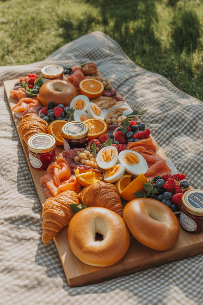 Combine sweet and savory elements for a well-rounded brunch picnic board. Include bagels with spreads, smoked salmon, hard-boiled eggs, fresh fruit, pastries, and mini jam jars. This picnic brunch idea is visually rich and makes grazing throughout the morning a joy.