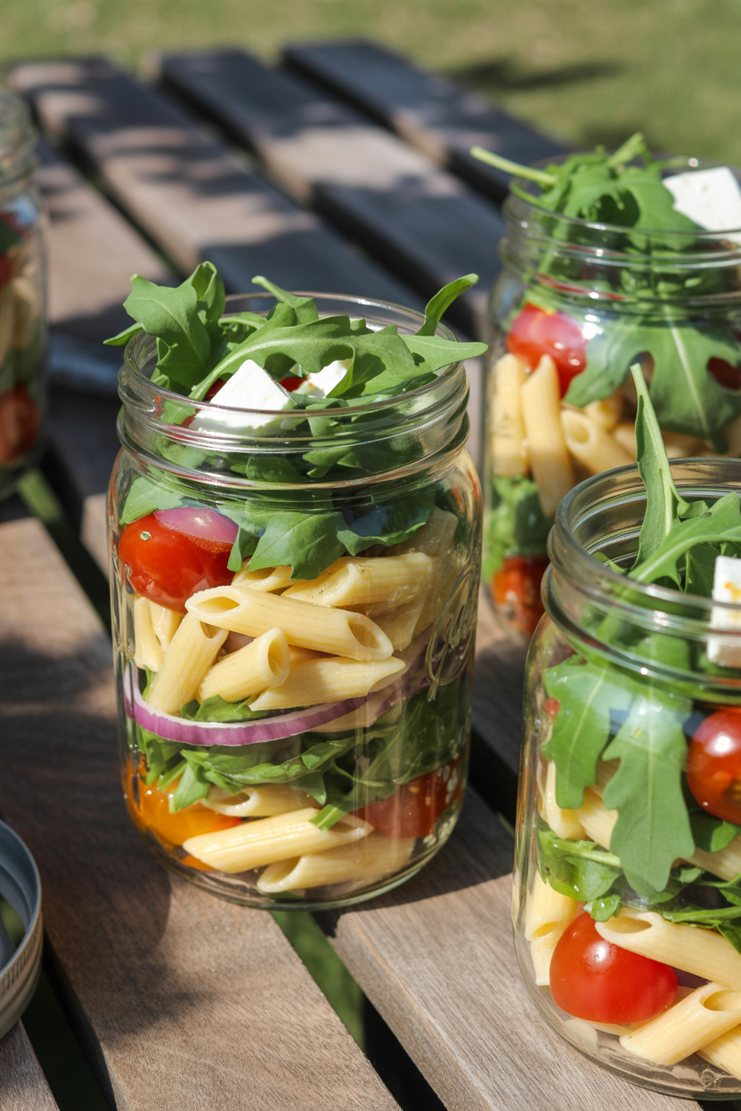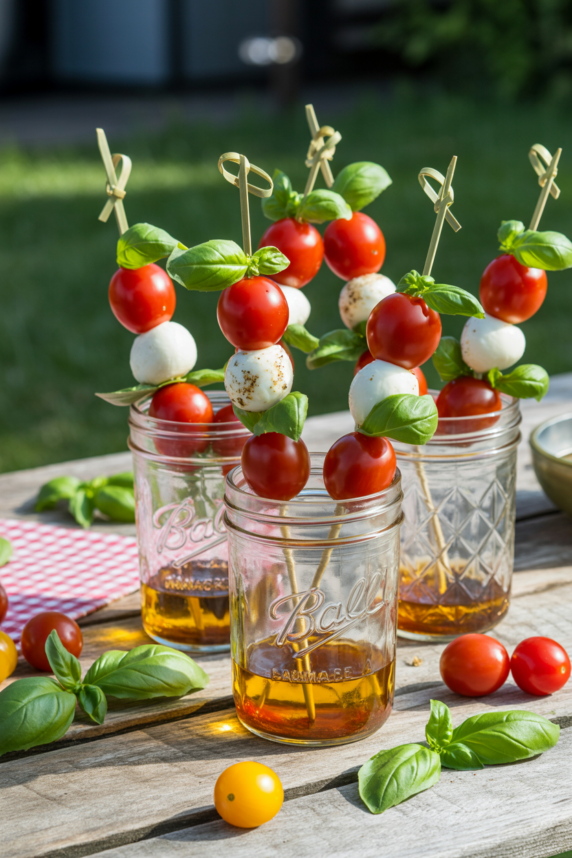 Caprese salad skewers can also be served vertically in mason jars with a drizzle of dressing at the bottom. Not only do they look beautiful this way, but the single-serve format makes cleanup a breeze and adds a touch of whimsy to your picnic lunch ideas.