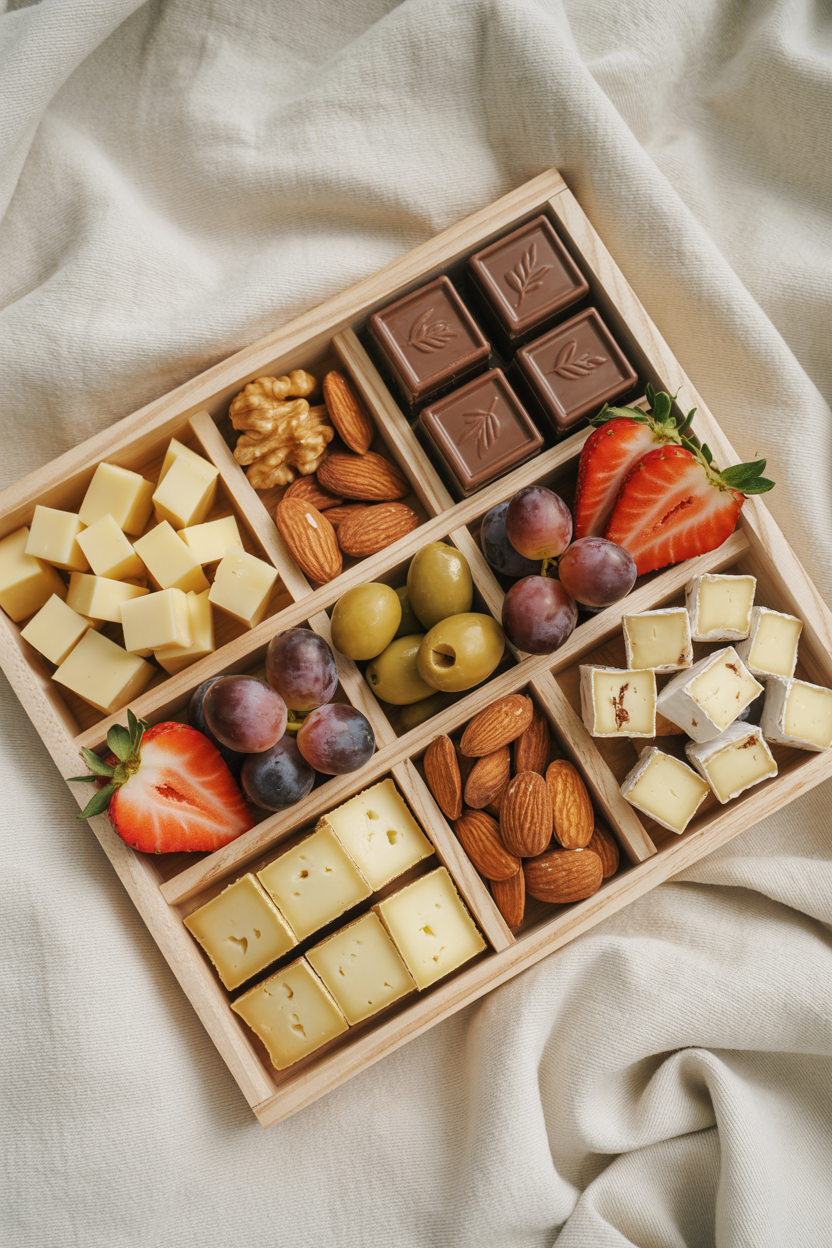 A grazing box is essentially a charcuterie board to-go. Use a divided container or bento-style box filled with small bites like cheese cubes, almonds, fruit, olives, and dark chocolate. It’s a curated, aesthetic picnic snack solution that travels well.