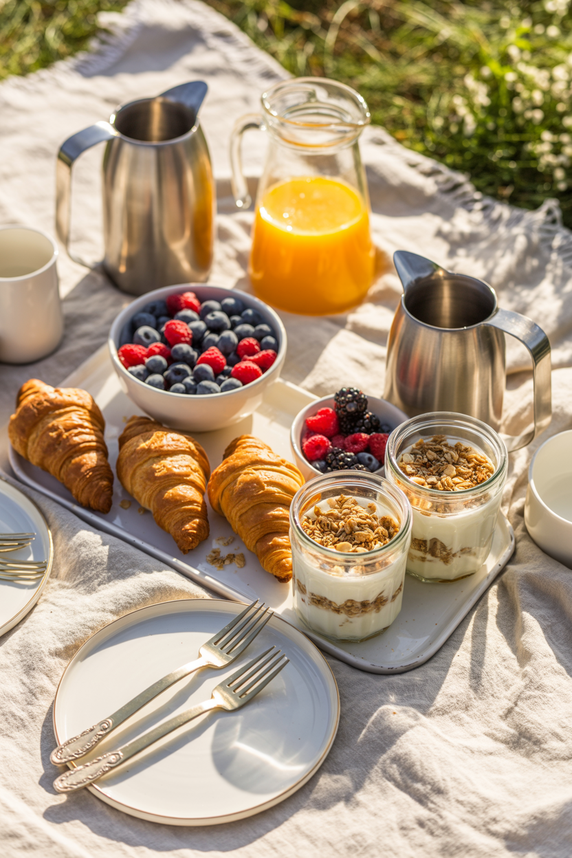 A breakfast picnic is a refreshing twist on the classic. Picture buttery croissants, seasonal berries, yogurt parfaits, and thermoses of hot coffee or chilled mimosas. It’s light, elegant, and effortlessly chic. Ideal for early risers or beachside mornings, this brunch picnic idea feels indulgent without the fuss.