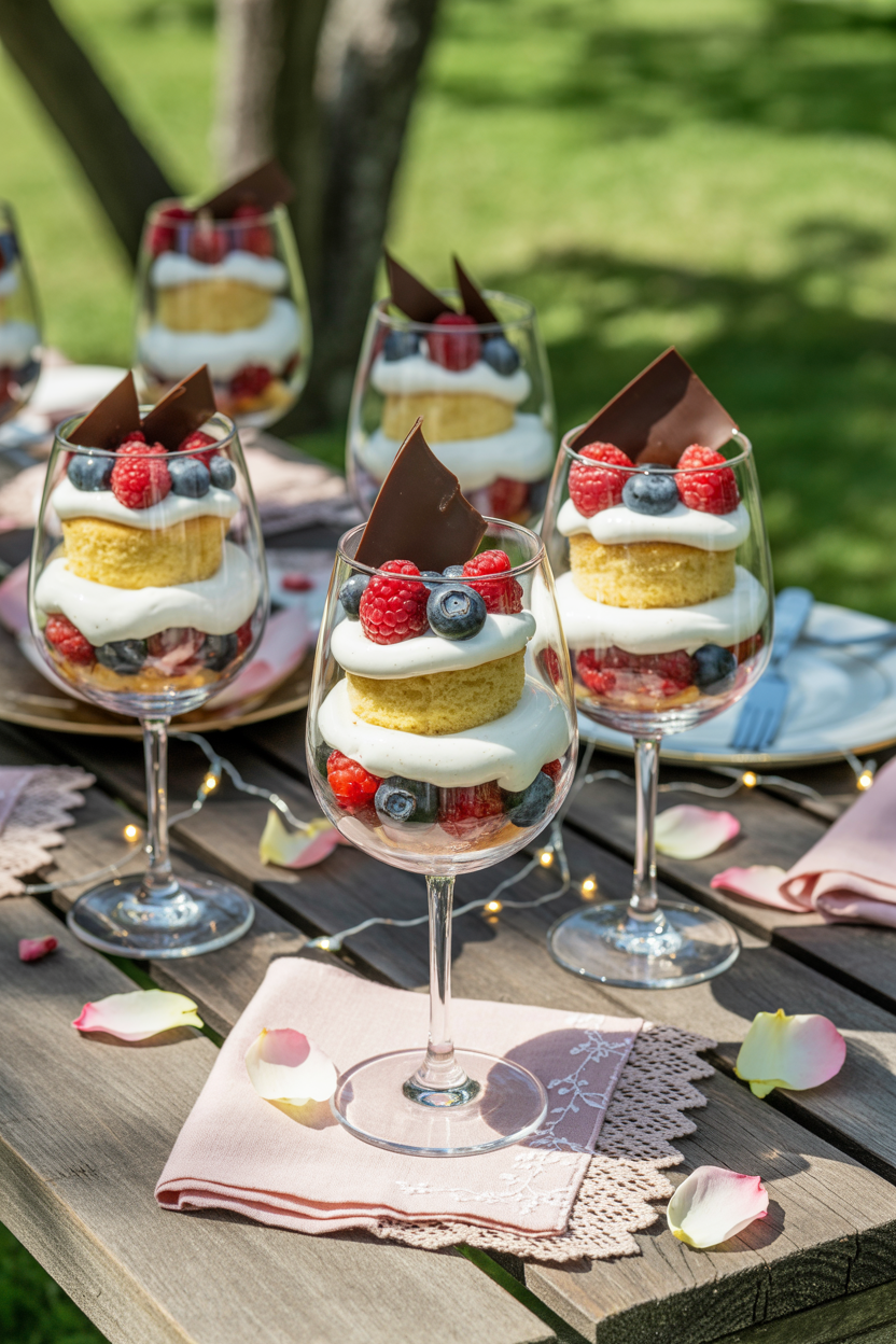 Layered desserts in wine or champagne glasses add a playful and sophisticated touch to your picnic aesthetic. Use ingredients like sponge cake, whipped cream, fresh fruit, and chocolate shavings for a dessert that’s both delicious and Instagram-ready. These are perfect for romantic picnic setups or birthday celebrations.