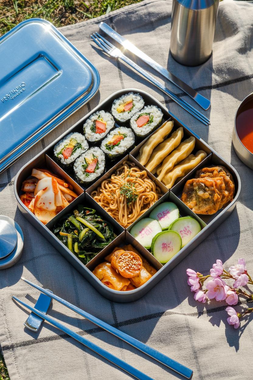 A Korean-style picnic box is full of texture and color. Include kimbap (rice rolls), japchae noodles, spicy cucumber salad, and mini dumplings. These picnic foods are packed with flavor and neatly portioned, making them perfect for stylish lunches or sharing with friends.