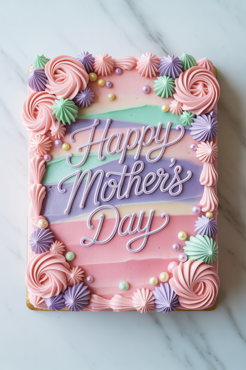 A Mother’s Day sheet cake is perfect if you want something easy but still beautiful. Use pastel frosting, add sprinkles or piped borders, and write a heartfelt message across the top. Simple!