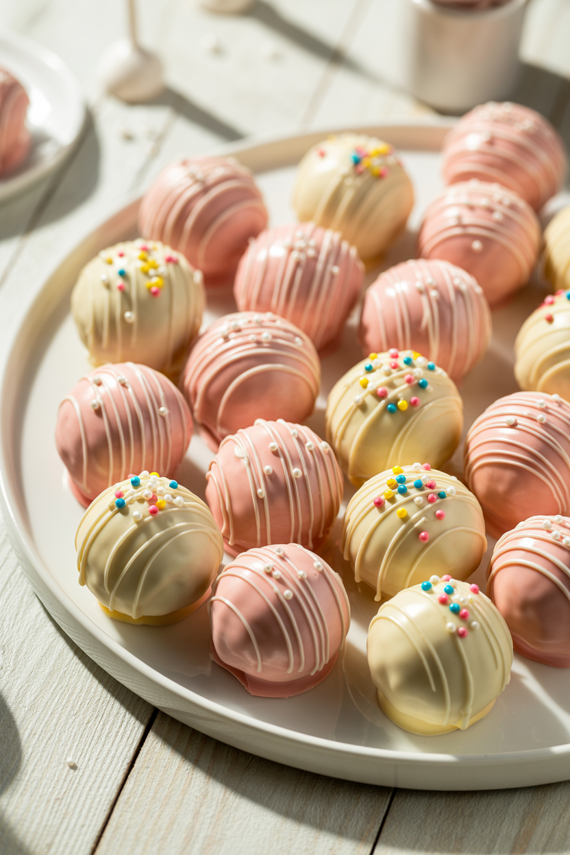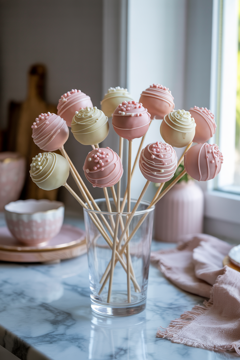 Mother’s Day cake balls are bite-sized, fun, and easy to customize. Coat them in pink or white chocolate and decorate with sprinkles or drizzle. These are perfect if you want a casual, shareable twist on traditional Mother’s Day cake ideas.