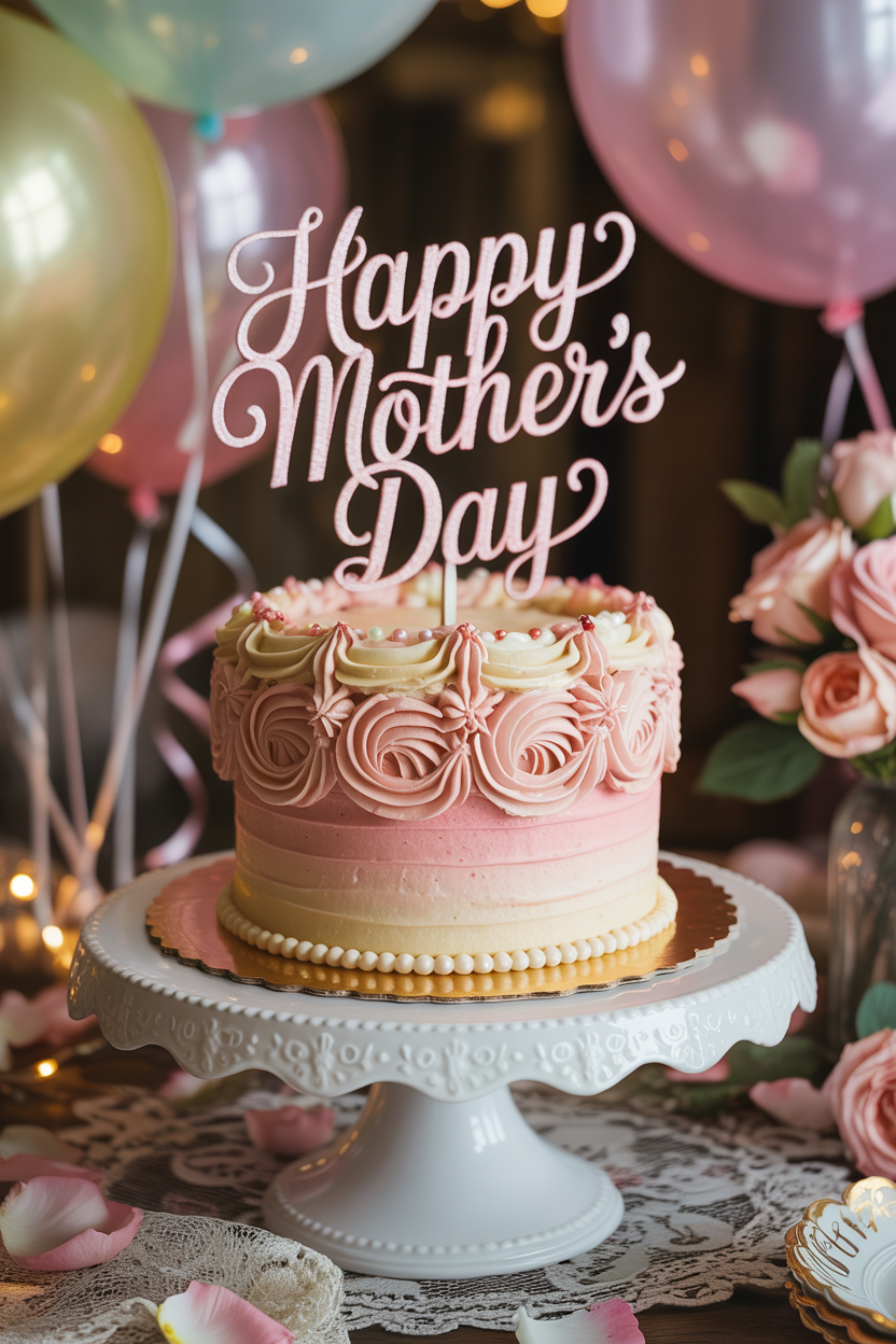 A pink Mother’s Day cake with ombre rosettes is effortlessly pretty and surprisingly simple to achieve. By piping rosettes in gradually deepening shades of pink, you get a stunning gradient effect. This is one of the most popular Mother’s Day cake ideas simple enough for beginners but still visually impressive.