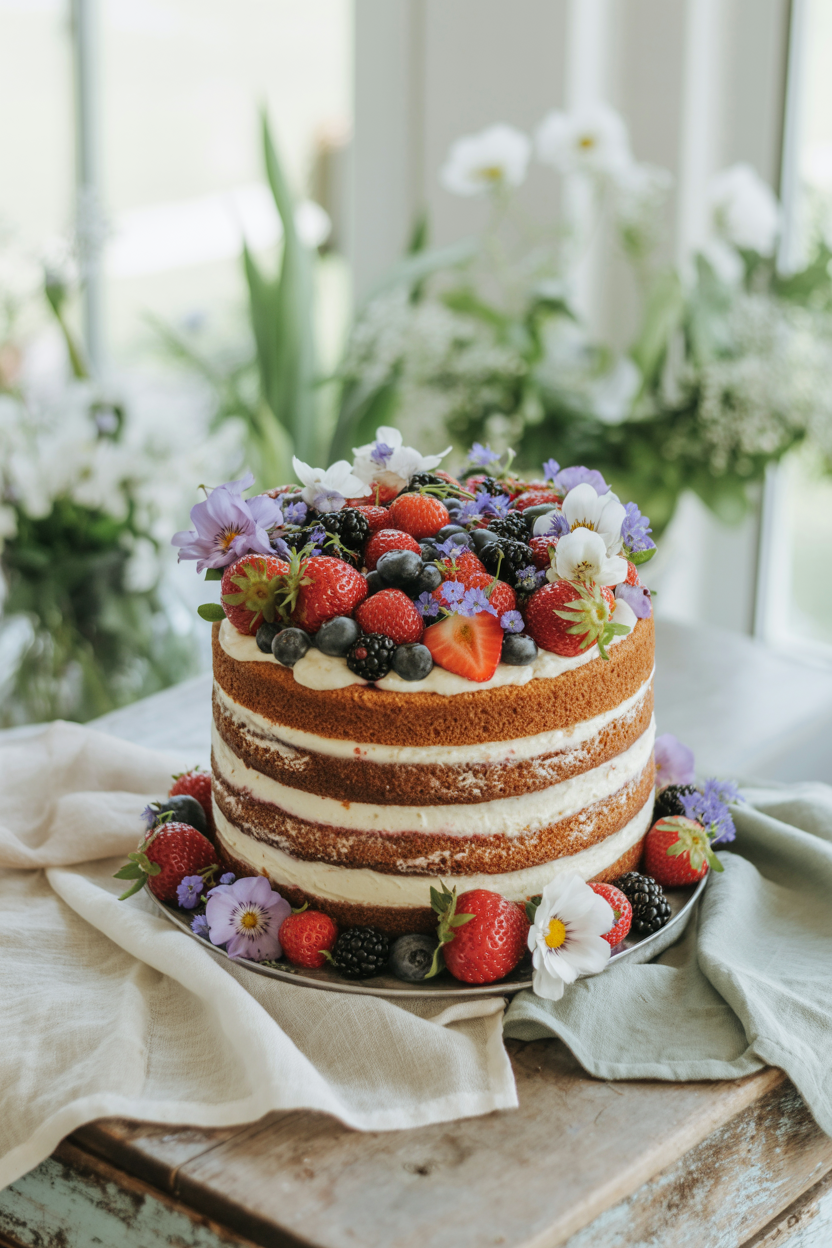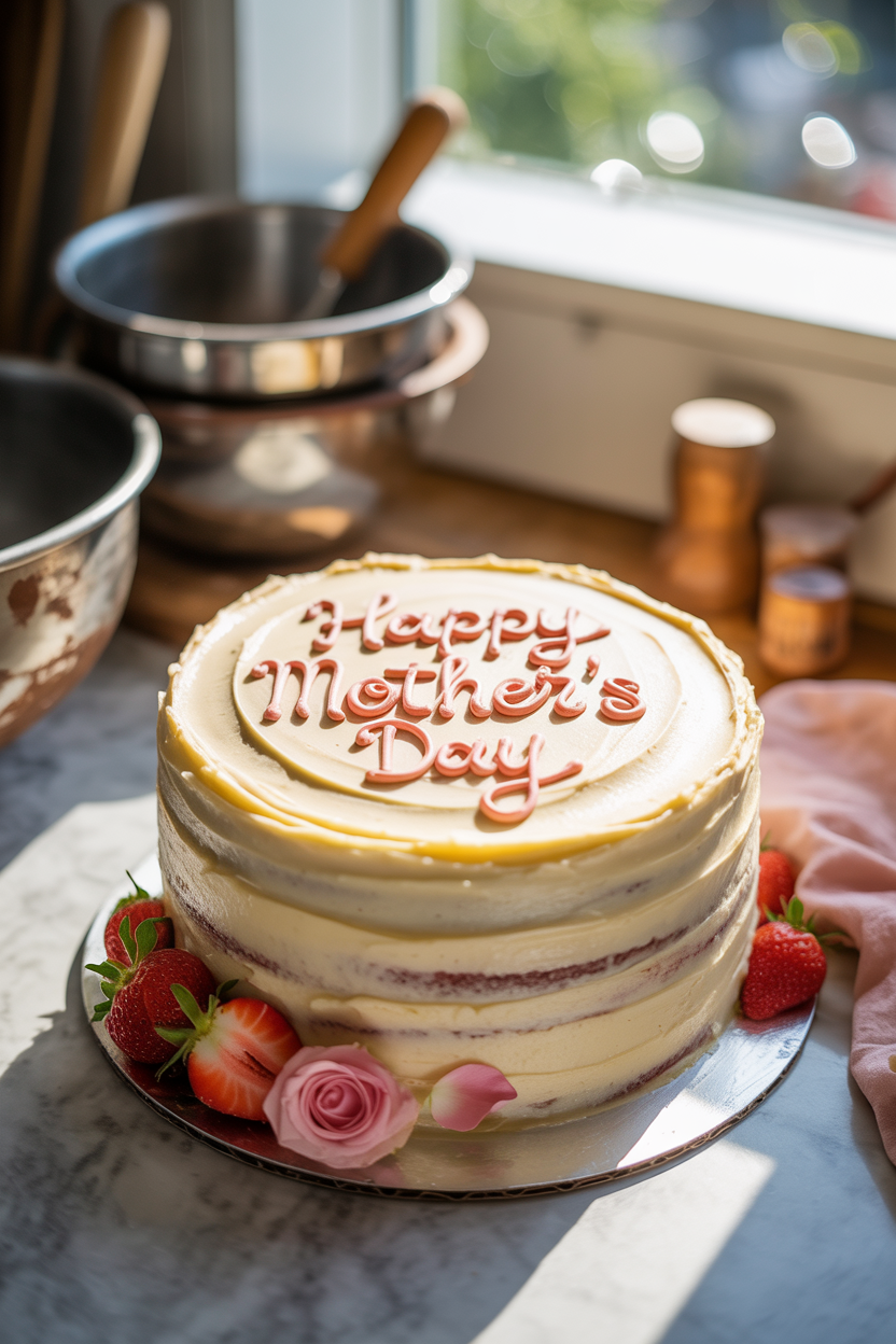 A naked cake showcases the layers with minimal frosting, giving it a rustic, elegant feel. Add fresh berries and edible flowers for a natural, organic look. This is one of the best Mother’s Day cake ideas if you love a less-is-more aesthetic.