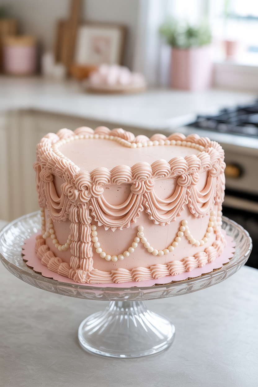 If you want something dramatic and nostalgic, a heart-shaped Mother’s Day cake in vintage Lambeth style is pure magic. These cakes feature intricate piping, ruffles, and scrollwork that feel incredibly special. Use soft pink or cream tones and add a “Happy Mother’s Day” message to tie it all together.