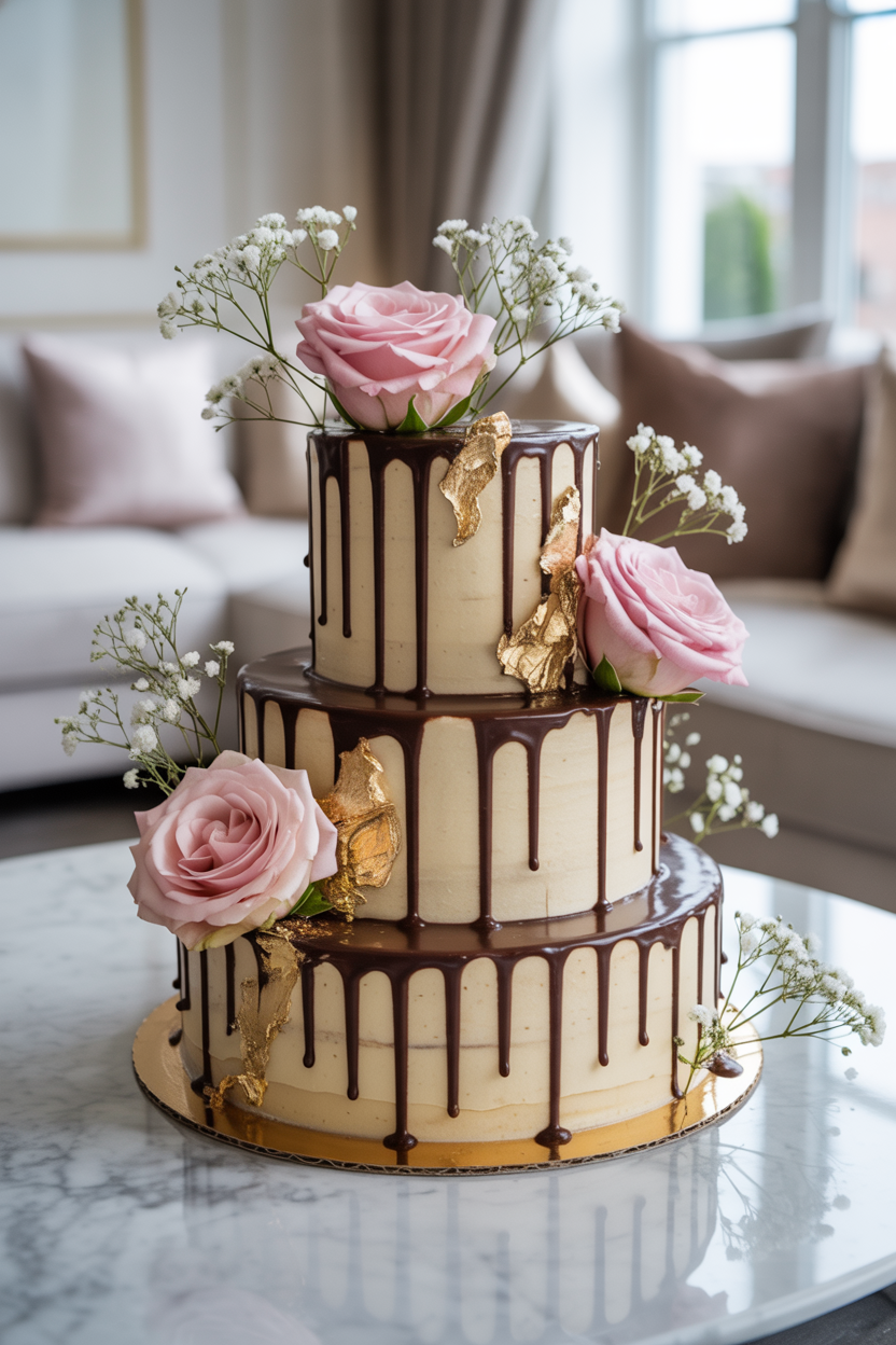 An elegant drip cake instantly elevates any Mother’s Day cake idea. Use a smooth buttercream base, then add a glossy chocolate drip and top it with fresh or buttercream roses. This style works especially well if you want a cake that feels both luxurious and celebratory.