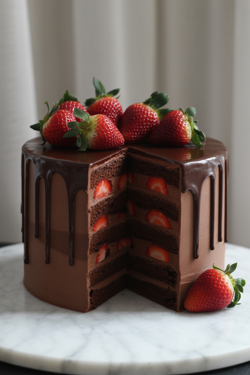 You can never go wrong with a chocolate cake paired with fresh strawberries. The rich chocolate layers combined with bright, juicy berries create a beautiful contrast that looks as good as it tastes. Add chocolate ganache and whole strawberries on top for a bakery-style finish.