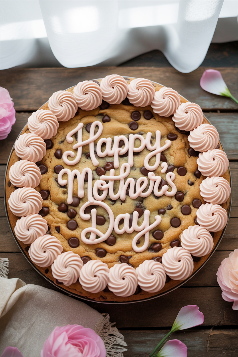 A Mother’s Day cookie cake is such a fun alternative to traditional layer cakes. Use a giant chocolate chip cookie as the base and decorate it with buttercream borders and a sweet message. It’s one of those Mother’s Day cake ideas that feels nostalgic and crowd-pleasing.