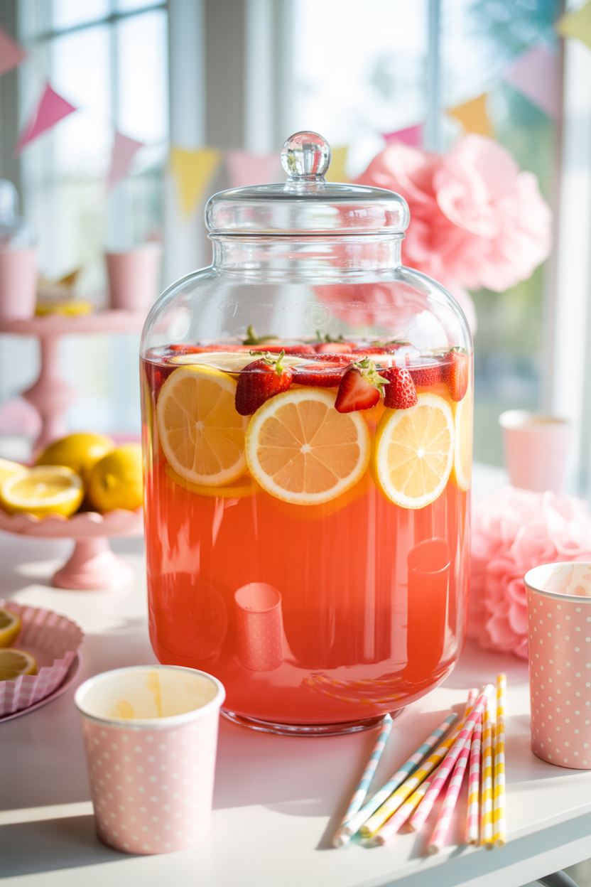 A pink lemonade baby shower punch is one of the easiest ways to add color and charm to your drink table. This classic baby shower drink looks beautiful in a glass beverage dispenser with floating lemon slices and fresh strawberries. To make an easy pink punch for a baby shower, mix pink lemonade, lemon-lime soda, and a splash of cranberry juice for color. Garnish with berries or edible flowers for a pretty finishing touch.