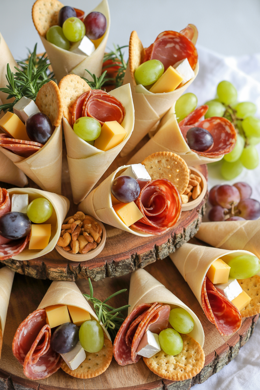 Charcuterie cones are a creative twist on the classic grazing board. Fill paper cones with cheese cubes, crackers, grapes, and cured meats for an easy baby shower appetizer. These individual servings look stylish and make mingling around the party even easier.