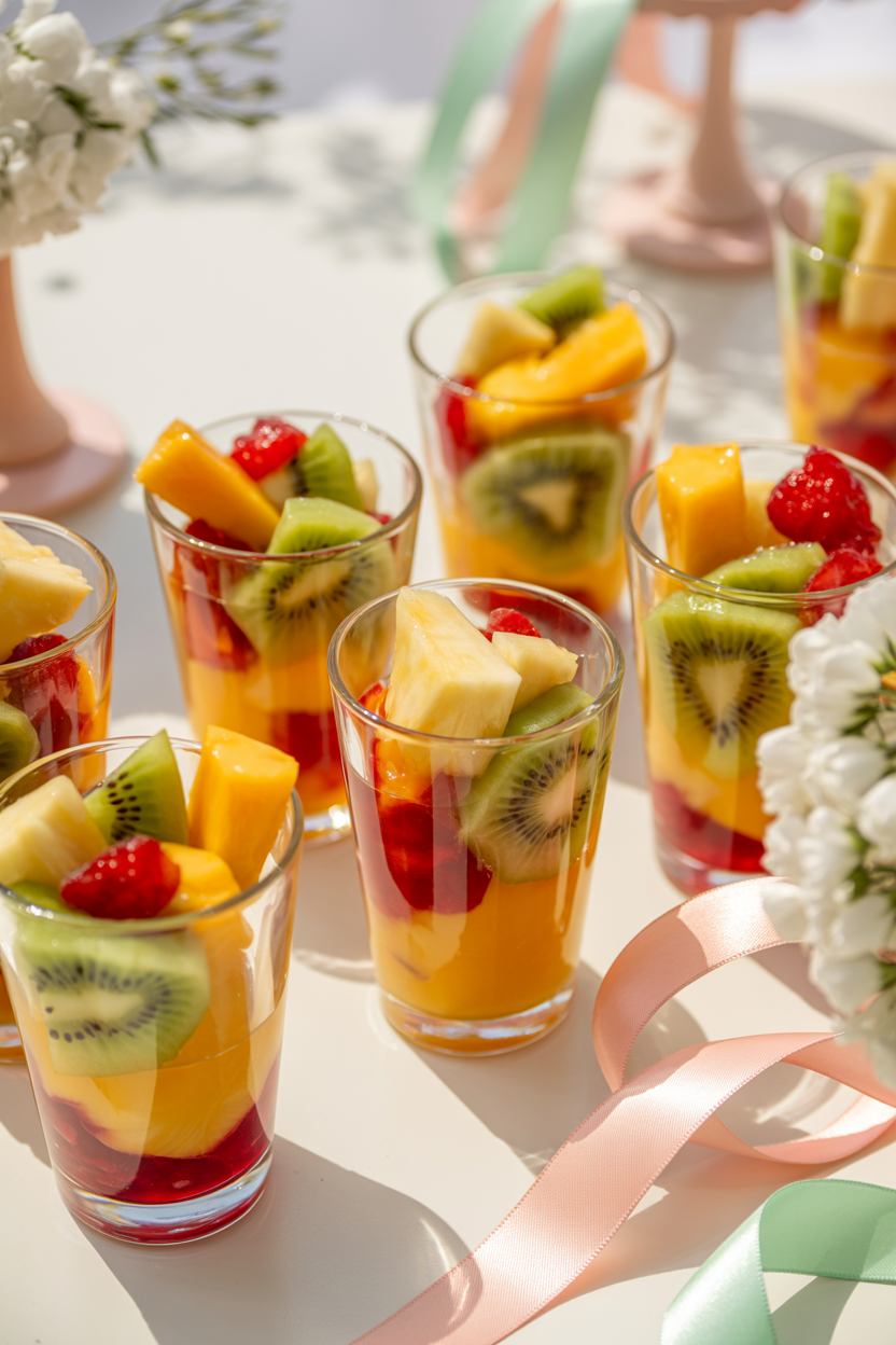 Fresh fruit is always a welcome addition to a baby shower food menu. Tropical fruit salad cups filled with pineapple, mango, berries, and kiwi add color and freshness to the table. Serve them in small clear cups or jars for a bright and healthy option.