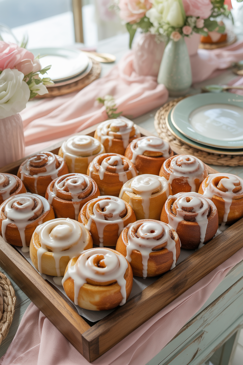 If you’re hosting a baby shower brunch, mini cinnamon rolls are always a hit. These warm, sweet pastries feel cozy and comforting while still looking adorable when served in small portions. Arrange them on a platter with a drizzle of icing for a bakery-style display.