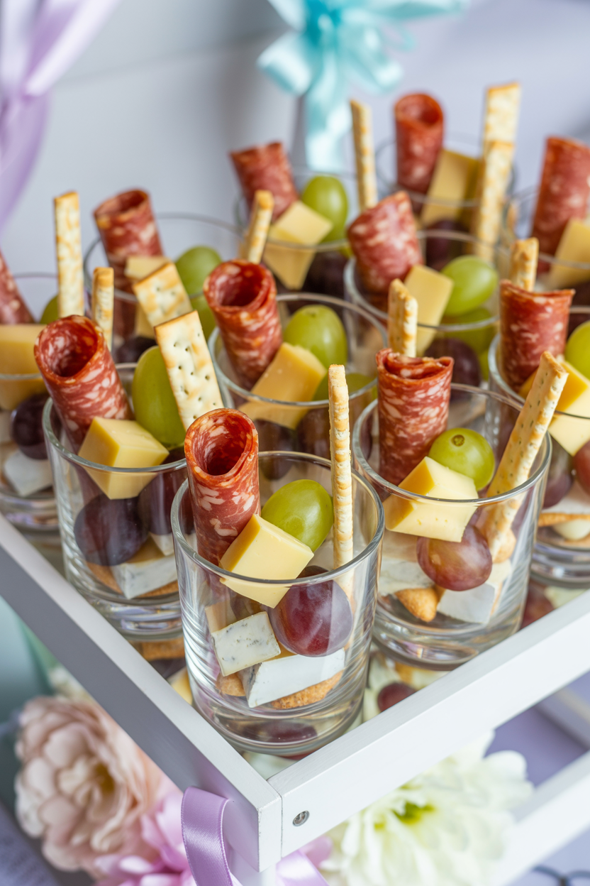 Mini charcuterie cups are one of my favorite easy baby shower food ideas because they look impressive but take very little effort. Fill small cups with cheese, crackers, olives, and fruit for a simple grab-and-go snack. These individual cups keep the table tidy and make serving easy.