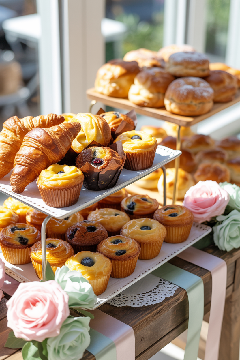 A breakfast pastry bar is a wonderful option for baby shower brunch food ideas. Offer a mix of croissants, muffins, danishes, and scones so guests can build their own plate. Arrange everything on tiered trays for a bakery-style display.