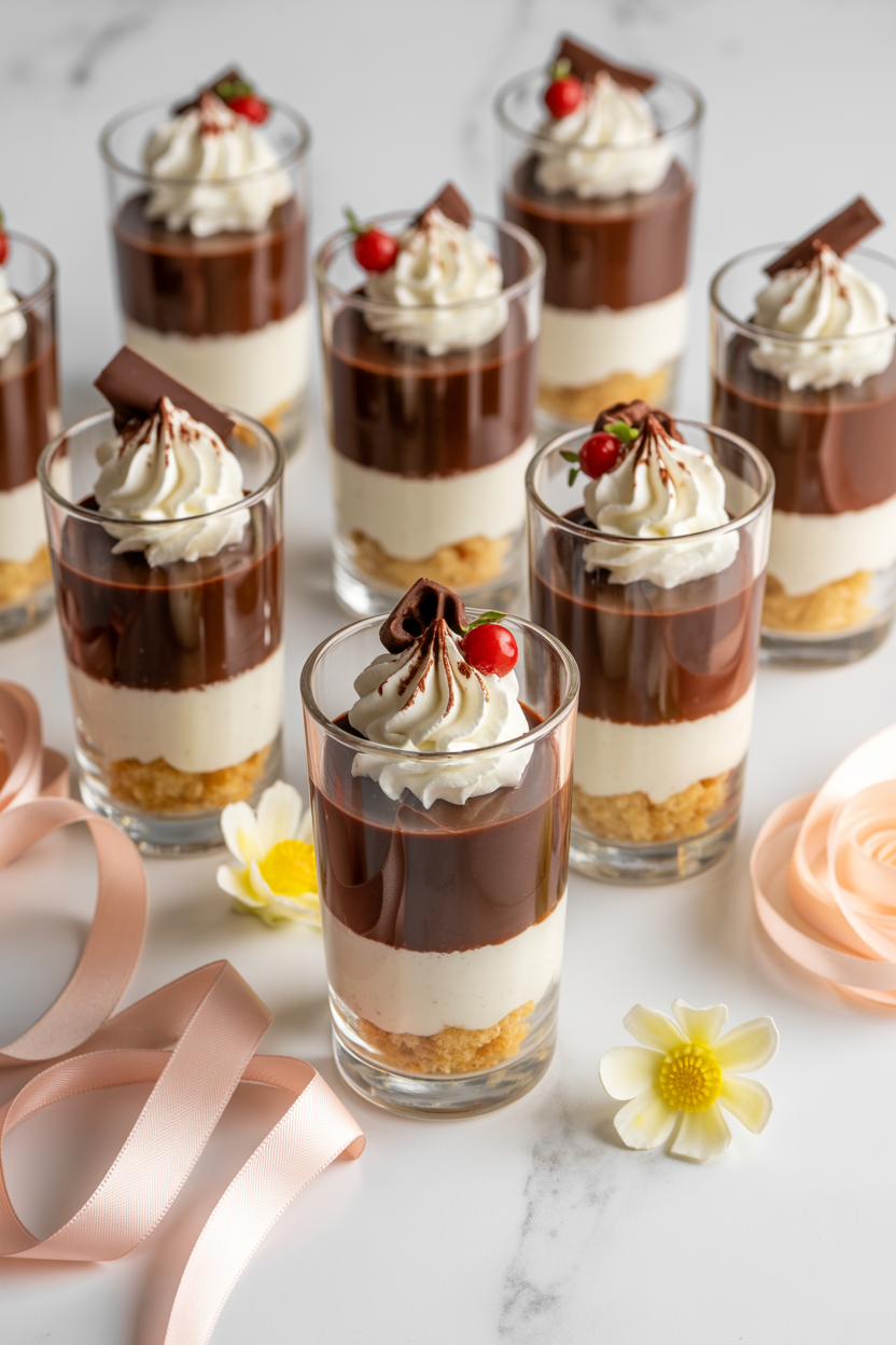 Mini dessert shooters layered with pudding, whipped cream, and cake create a beautiful baby shower dessert table. The clear cups show off the layers, making them as pretty as they are delicious. These little treats feel special without requiring complicated recipes.