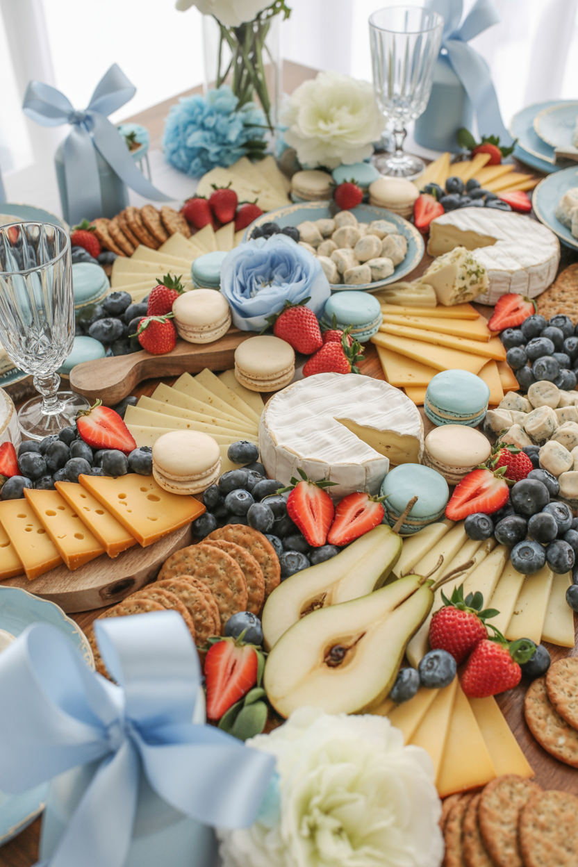A grazing table filled with cheeses, fruits, crackers, and sweet treats creates a relaxed and inviting atmosphere. Baby shower grazing tables are perfect for casual celebrations where guests can snack throughout the event. Add flowers and themed decorations to make the display feel festive.