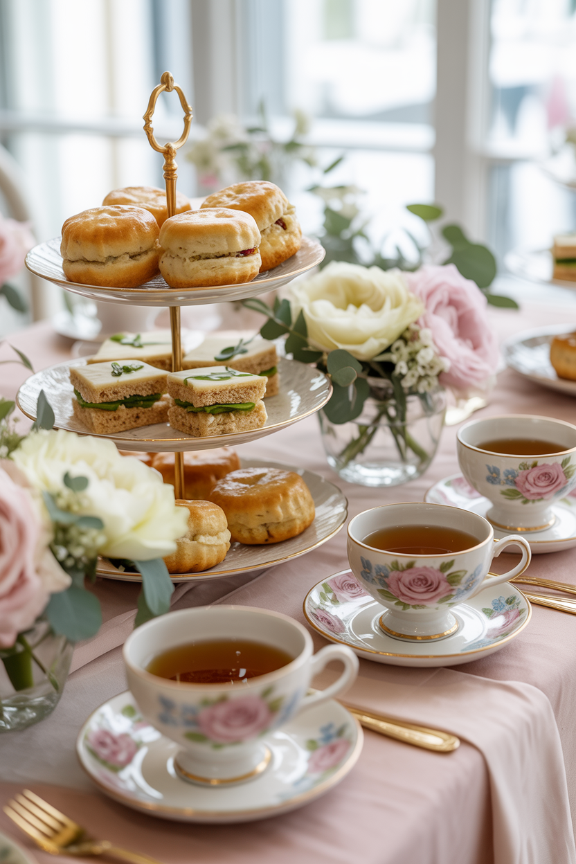 A tea party baby shower menu is effortlessly charming. Think mini pastries, tea sandwiches, scones, and delicate desserts served on tiered trays. This classic setup creates a beautiful and memorable baby shower experience.