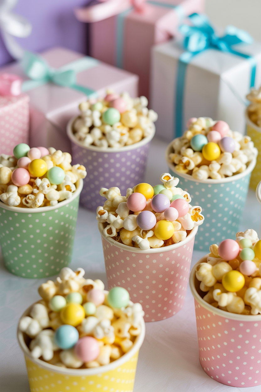 Popcorn snack mix is a playful addition to a baby shower snack table. Toss popcorn with white chocolate drizzle, pastel candy, and sprinkles for a sweet treat. Serve it in small cups or bags for a fun party favor.