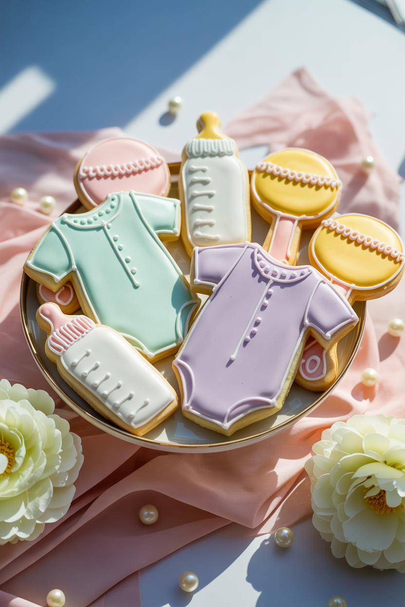 Baby shower sugar cookies decorated with onesies, baby bottles, or tiny rattles add instant charm to your dessert table. Royal icing baby shower cookies in soft pastel colors look especially beautiful for photos. These cookies are easy to customize to match any theme, from woodland baby showers to elegant floral parties.
