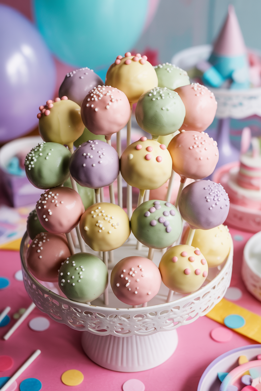 Cake pops are a classic baby shower food idea because they’re cute, portable, and easy to decorate. Dip cake pops in pastel chocolate and add sprinkles or tiny fondant decorations to match your theme. These bite-size desserts are perfect for guests who want something sweet without committing to a full slice of cake.