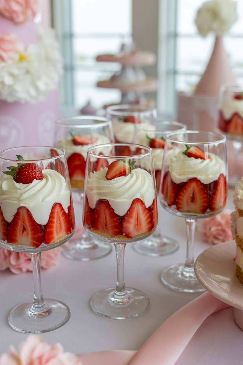Strawberry shortcake dessert cups are a fresh and pretty baby shower dessert idea. Layer cake cubes, whipped cream, and strawberries in clear cups so the layers show through. These individual desserts look beautiful on the table and are easy for guests to grab.