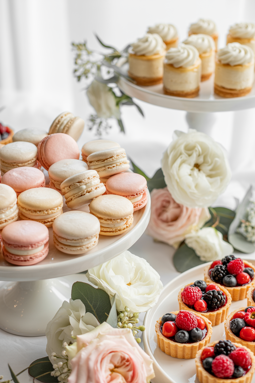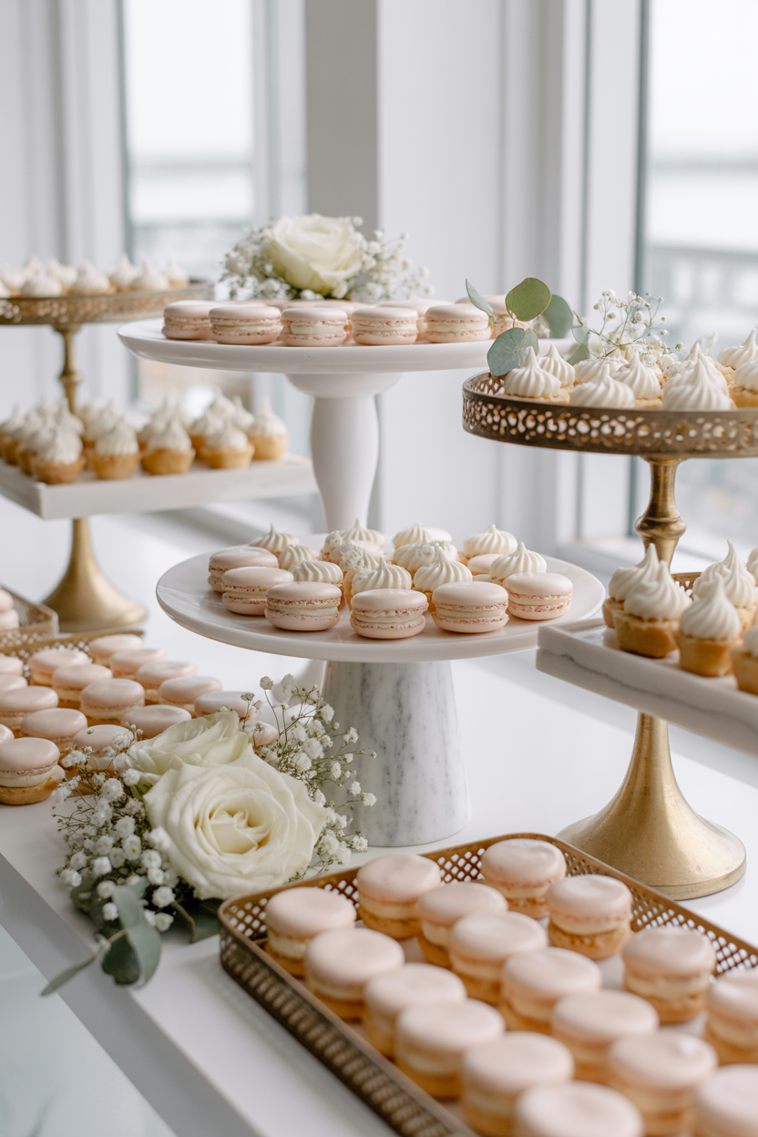 A wedding dessert table is where you can really lean into softness and detail. I like incorporating macarons, mini tarts, and petite cakes in a cohesive color palette. It creates that layered, editorial look that photographs beautifully.