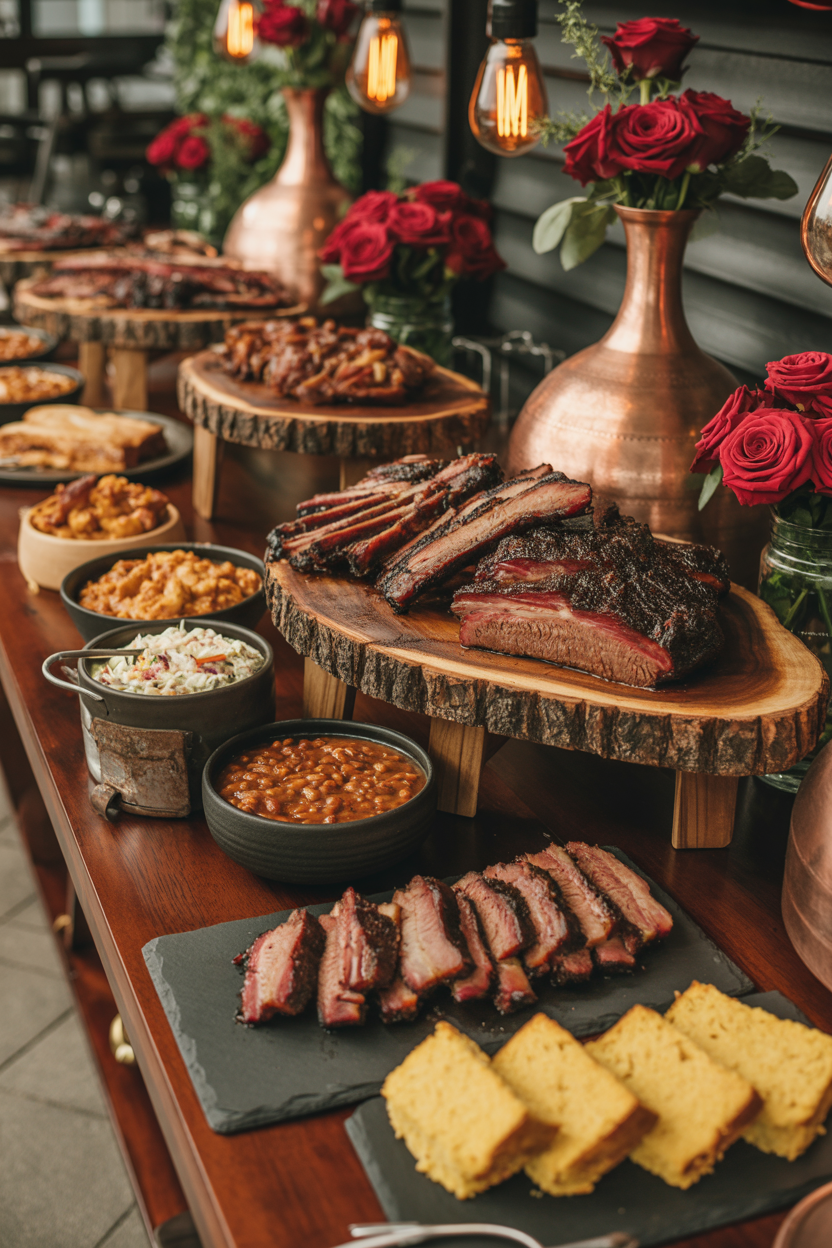 BBQ wedding food works beautifully for relaxed celebrations. Pulled pork, brisket, and classic sides create a comforting, generous spread. I like to elevate it with clean serving pieces and thoughtful layout.