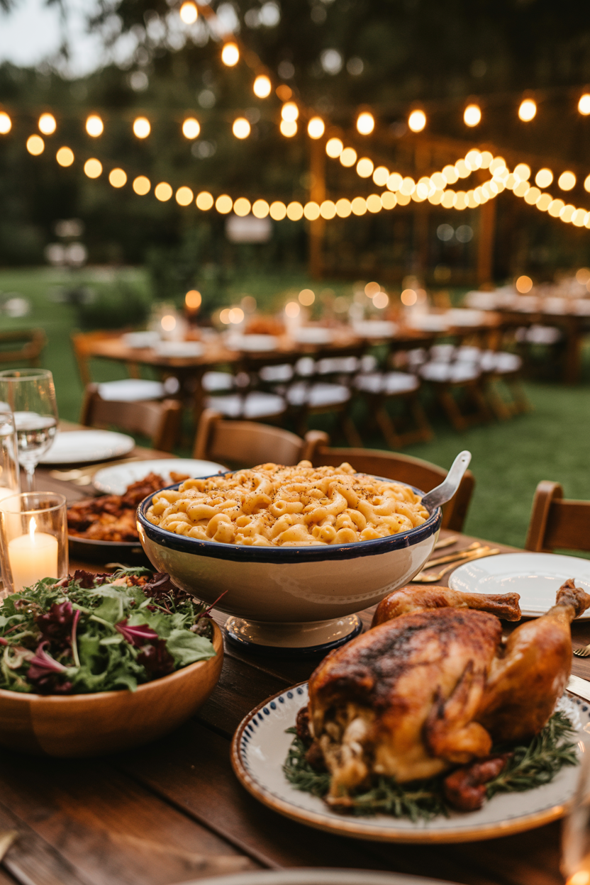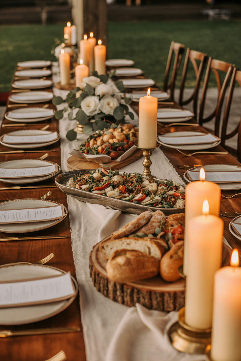 Backyard weddings benefit from comfort food done well. Think familiar dishes, but presented with intention—wood boards, neutral linens, and layered serving heights.