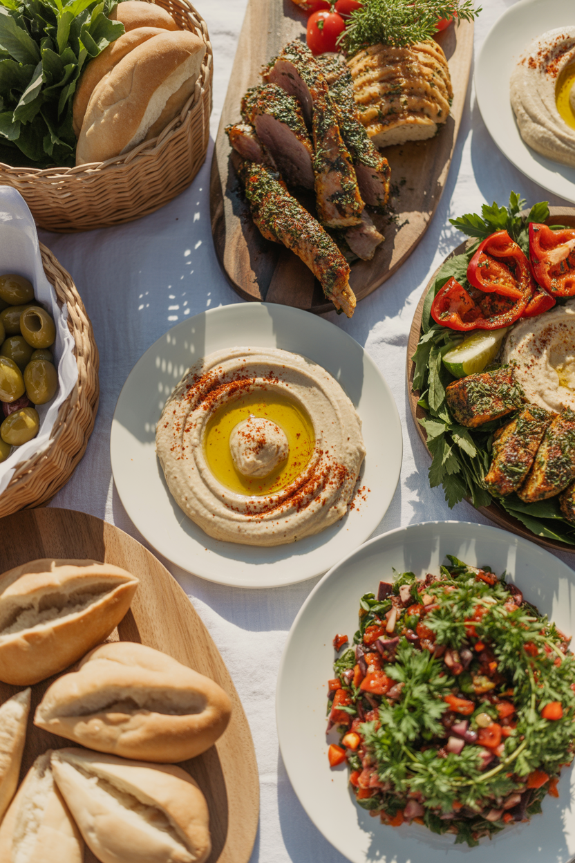 Mediterranean spreads are naturally vibrant. Hummus, grilled meats, fresh salads—it’s colorful and balanced. I usually lean into simple, abundant presentation here.