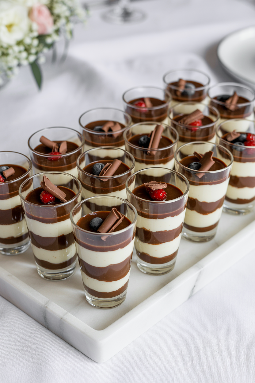 Dessert shooters are one of my favorite ways to add height and variation. Served in small glasses, they’re easy to grab and visually clean.