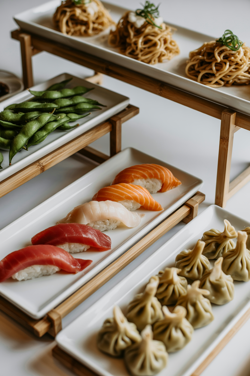 Asian wedding food ideas—like sushi, noodles, or dumplings—offer variety and visual interest. I like keeping the presentation minimal to let the food stand out.