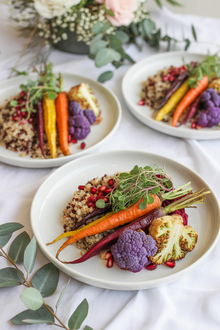 I always include thoughtful vegetarian options. Grain bowls, roasted vegetables, and fresh salads can be just as visually appealing as any entrée.