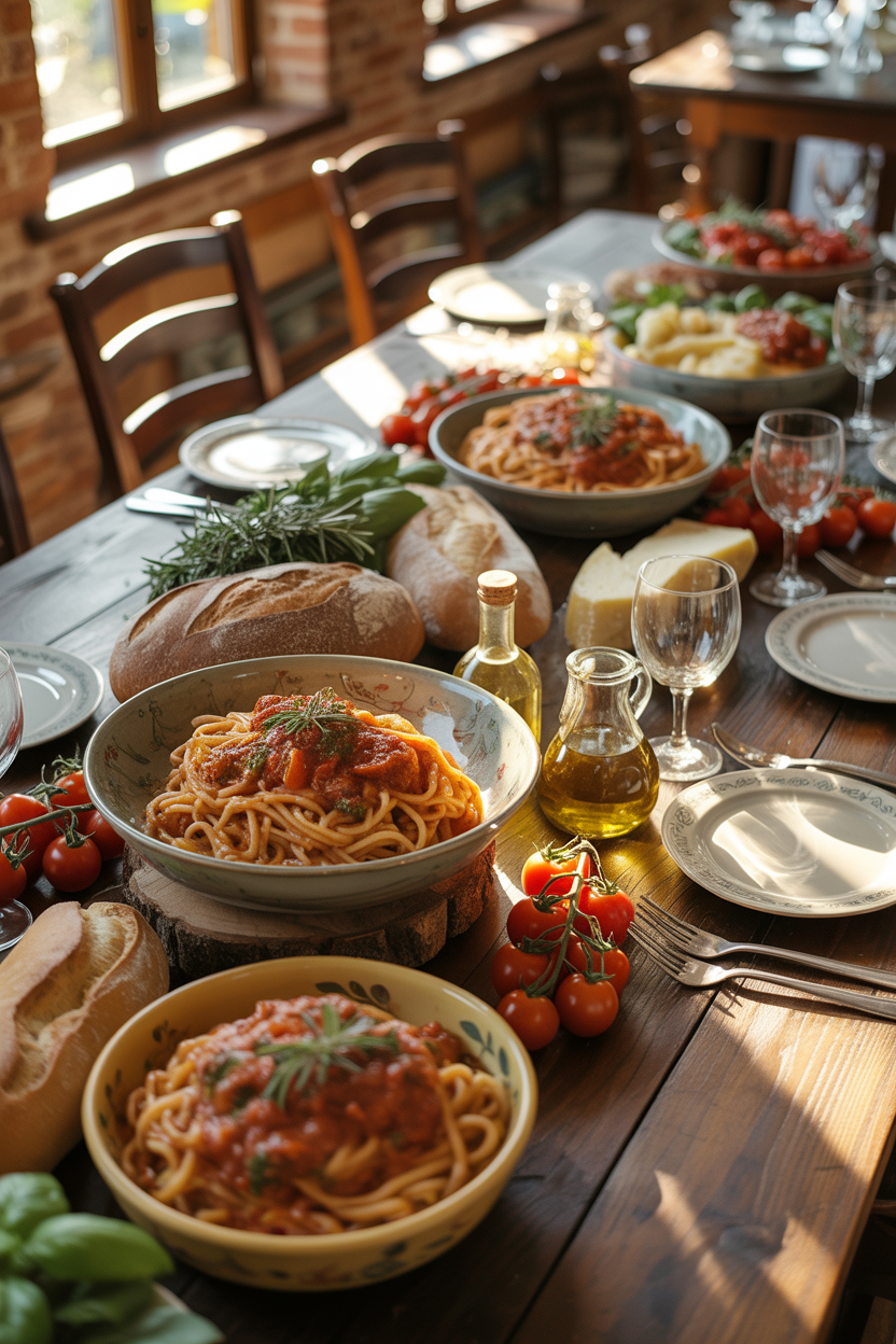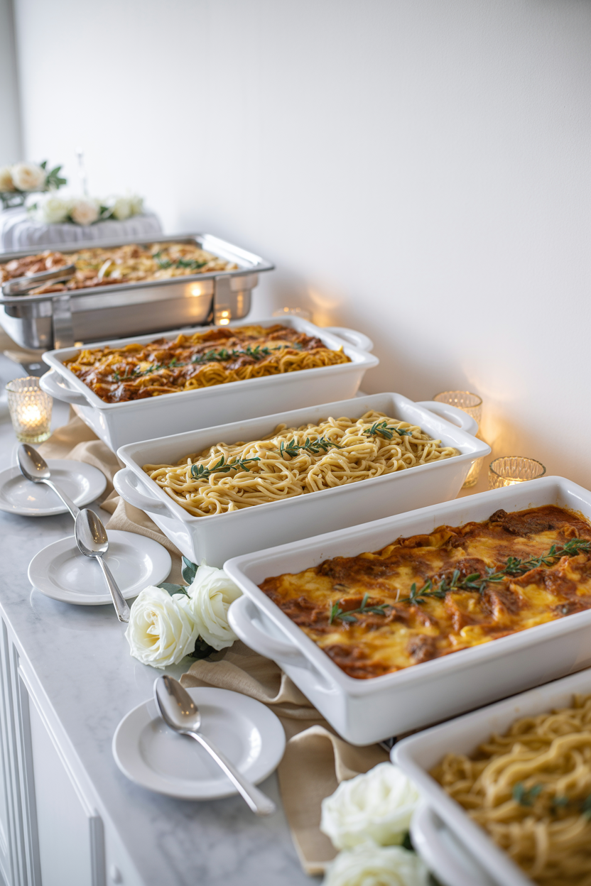 Italian wedding food is always a crowd favorite. Bowls of pasta, rustic loaves, olive oil, and herbs create a warm, abundant feeling. It’s approachable but still feels special when styled thoughtfully.