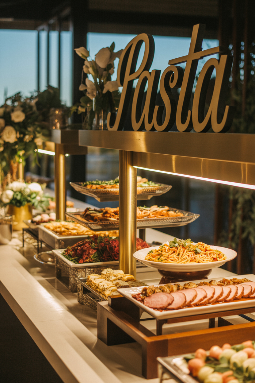 Food stations—like pasta bars or carving stations—bring energy into the room. Guests love customizing their plates, and it keeps the flow of the reception dynamic. I usually keep the styling clean and cohesive so each station still feels part of the overall tablescape.