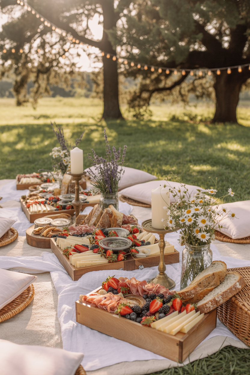 Picnic-style setups are perfect for outdoor weddings. Individual boxes or neatly arranged platters keep things organized while still feeling relaxed.