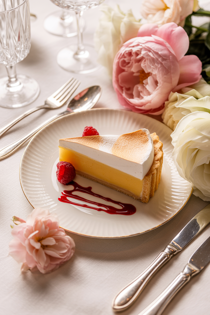 Ending with a plated dessert feels intentional. A beautifully styled tart or slice of cake gives the evening a polished finish.