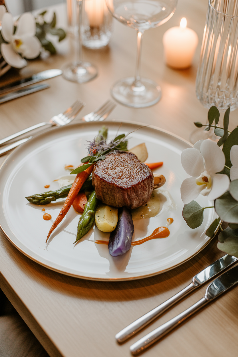 There’s something timeless and romantic about a plated dinner. A beautifully composed entrée with thoughtful garnishes feels polished and calm. I recommend focusing on color contrast and clean plating to keep it visually appealing.