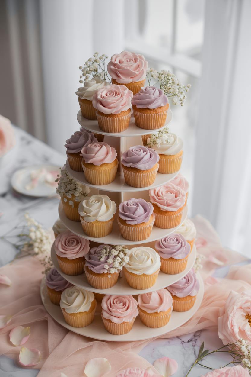 Cupcake towers are such a charming alternative to a traditional cake. I love using soft tones, floral toppers, or delicate piping to create that feminine, layered look without overwhelming the table.