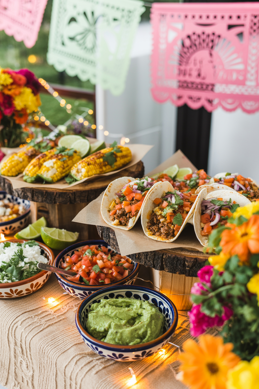 A Mexican food bar brings color and energy. Tacos, elote, fresh salsas—it’s vibrant and interactive. I like to keep the setup structured so it feels elevated rather than chaotic.